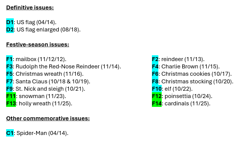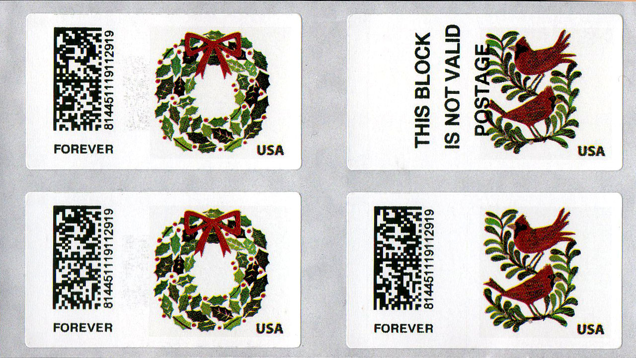 Zoals sinds 2012 gebruikelijk, heeft de US Postal Service ook in de laatste maanden van 2025 automaatzegels met een Kerstmotief in de self service kiosks geplaatst. Er is geen specifieke eerste dag van gebruik: de beheerder van het postkantoor zet de nieuwe rollen er naar eigen goeddunken in. Maar deze keer met een primeur, want de velletjes van 10 zegels tonen niet één motief, maar twee verschillende naast elkaar. Links een kerstkrans en rechts een mistletoe-tak met twee red cardinals.