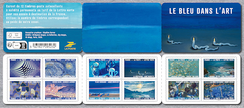 Het maakt de onderwerpen niet minder bijzonder. Zo kiest men geregeld, zoals nu, een onderwerp uit de schilderkunst. En dit keer met een origineel uitgangspunt: blauw in de kunst. Ook nu weer in een boekje van twaalf zegels. Het is op 5 januari van dit jaar verschenen. Het blauw aan de hemel, of het blauw van de zee. Deze kleur heerst in de geschiedenis van de schilderkunst en levert schilders inspiratie. De kleur blauw is ook symbool van de vrede, van puurheid en oneindigheid.